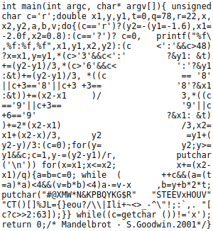 Once upon a time, I wrote a Mandelbrot set generator, where the C code was shaped like a Mandelbrot set